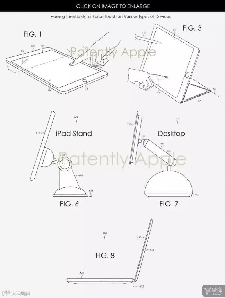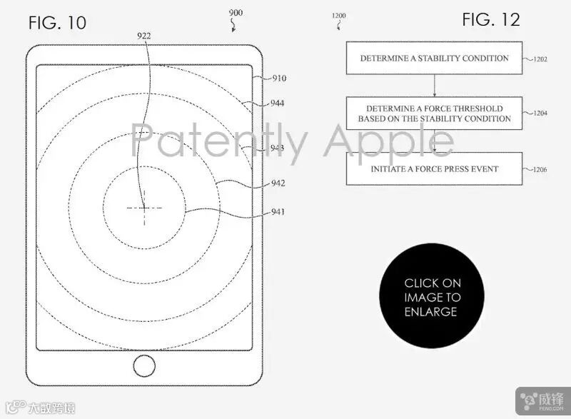 更具体地说,苹果在其总结中提到,他们的发明一般涉及具有触敏表面或区域的电子设备,这些触摸敏感表面或区域被配置为可接收用户基于力的输入。这些设备会配置多个按压传感器,用以检测超过预定力阈值的触摸。苹果还指出,设备还可以通过一个或多个传感器来确定电子设备的稳定性状况。设备会自动修改触敏表面力阈值来让屏幕达到稳定的状态。