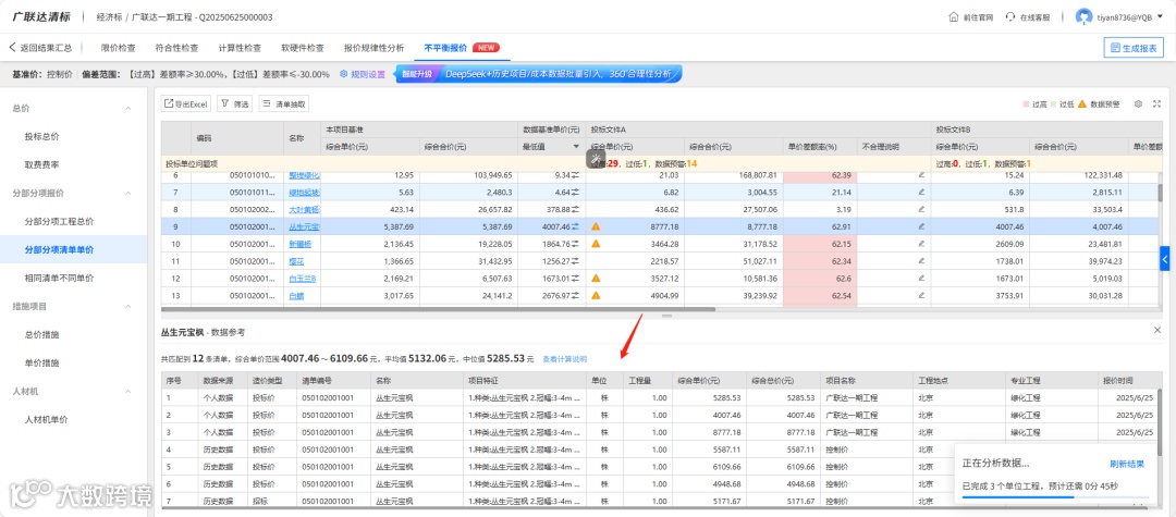 在原有不平衡报价的基础上,通过一键引入新数据辅助报价分析,利用deepseek精准匹配相同清单,360°高效分析,全面识别报价合理性风险!