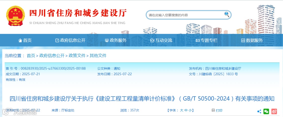 四川省住房和城乡建设厅关于执行《建设工程工程量清单计价标准》(GB/T 50500-2024)有关事项的通知