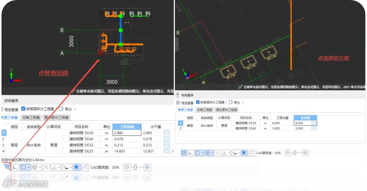 图纸中系统多、管径多,手动列项麻烦;算完管道后需要查看同规格同材质工程量或者整根变径竖向管工程量。