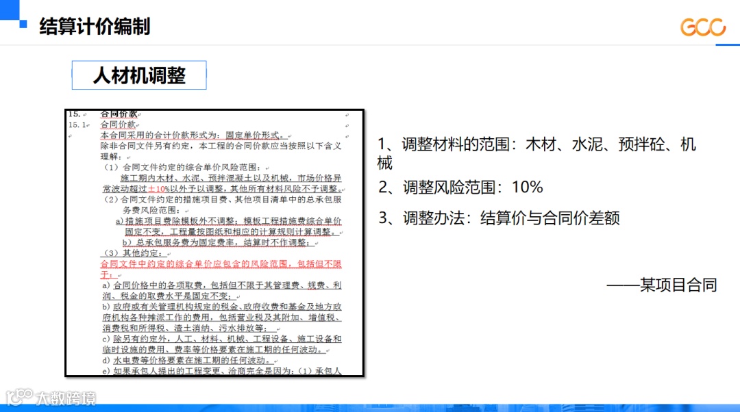 3.2.1 竣工结算需要考虑合同内和合同外两部分,对于合同内,遵循结算价=结算工程量*合同价格的思路,对于量的浮动需要考虑合同约定的幅度范围,整个项目,合同工期范围的人材机价格要进行调整,还要考虑变更签证及相关证明资料,是一项繁杂且至关重要的工作,在这期间围绕着项目发生,设计的变更,材料的涨幅都是需要综合考虑的。