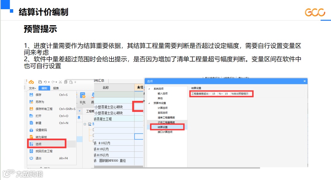 结算工程量提取完成,需要对工程量增加幅度进行判断,一般而言,合同中会约定,工程量的偏差幅度,软件支持在下拉菜单栏【选项】中,调出“结算设置”,可按照合同要求,设定幅度,一旦超出变化幅度,软件就会通过红色显示给出结算工程量的预警。