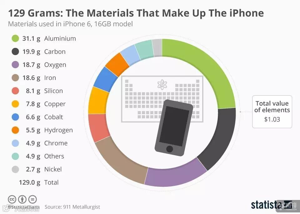 具体来看,制作16 GB 版本 iPhone 6 所使用的前四种材料分别是铝(31.1gm),碳(19.9gm),氧(18.7gm)和铁(18.6gm)。此外,还使用到了不同数量的硅,铜,钴,氢,铬和镍。以及用于制作手机的其他材料,包括金,镓,锡,钨等稀土材料。