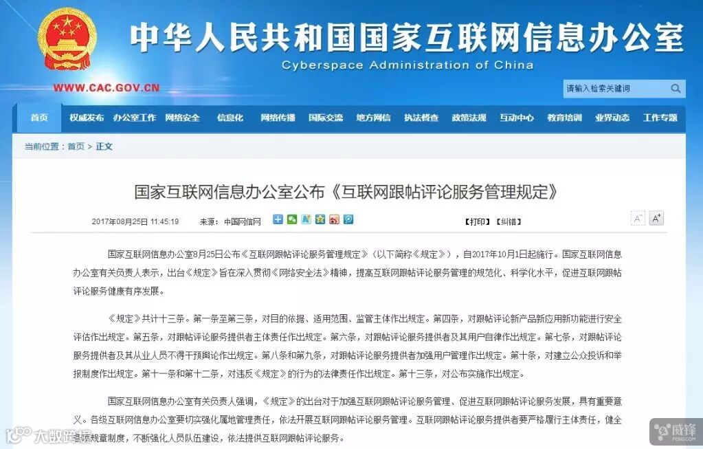 8 月 25 日,据人民网消息,国家互联网信息办公室 8 月 25 日公布《互联网跟帖评论服务管理规定》(以下简称《规定》),自 2017 年 10 月 1 日起施行。