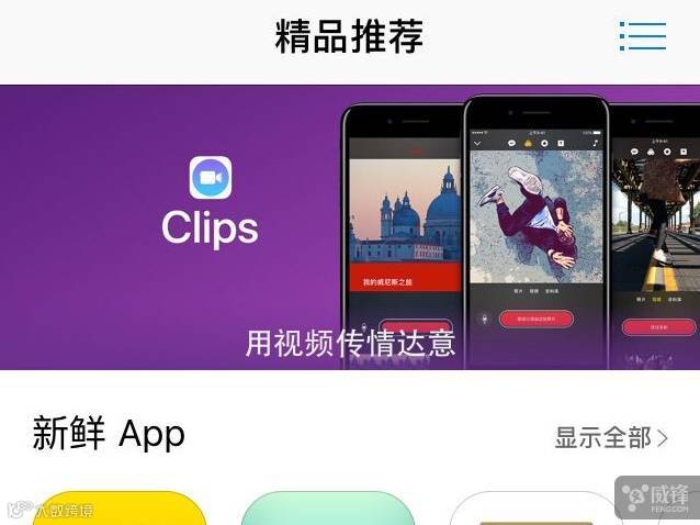 在中国区 App Store 精品推荐页面,用户可以在最顶层的幻灯片中看到 Clips。进入新鲜 App 版块中我们也能看到 Clips 就排在第一个。