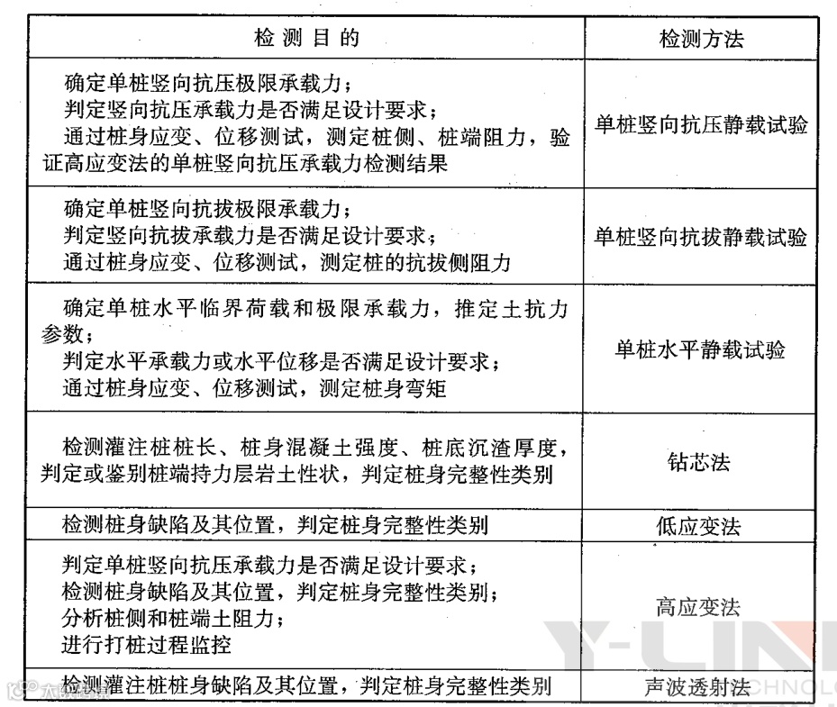 根据《建筑基桩检测技术规范》JGJ106-2014,我们了解到桩基检测主要有7种方法,检测方法及主要检测目的如下: