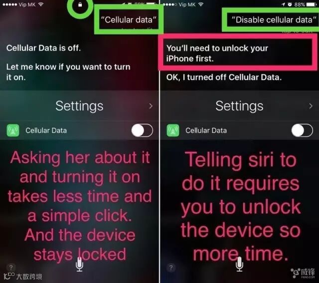 如屏幕截图所示,当 Siri 被要求调出蜂窝数据设置时,锁定屏幕上会出现一个关闭该功能的选项,用户无需输入密码。而当 Siri 被特别要求关闭蜂窝数据开关时,Siri 会首先要求密码。