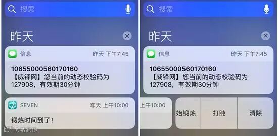 现在的 iOS 10 通知中心,用户可以通过 3D Touch(用力按下)、下拉、向左滑等多个手势,来对单个应用推送的通知做出“无需进入 App”的操作。