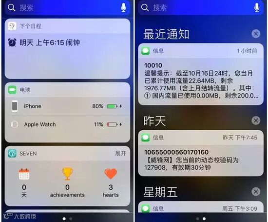 大家还记得 iOS 9 的下拉通知中心分为「今天」和「通知」两栏,而 iOS 10 新通知中心直接把分栏说明砍了,做成左右滑动两页,而左侧以往这里是 Spotlight 的建议页面,现在 Spotlight 建议页面和 Widget 融合在同一页面(日期也在这里)。原本存在感较低的 Widget 小工具,在新通知中心大放异彩。