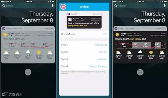 iOS 10 苹果向第三方开放了更多通知相关的 API 接口,现在我们已经可以看到一些 App 利用通知中心做文章了,比如天气应用《CARROT Weather》、星象指南《Sky Guide》、音乐雷达《Shazam》等等。