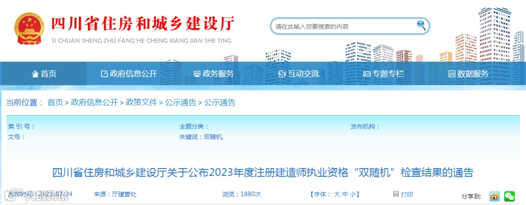 近日,四川省公布了2023年度注册建造师执业资格“双随机”检查结果的通告。