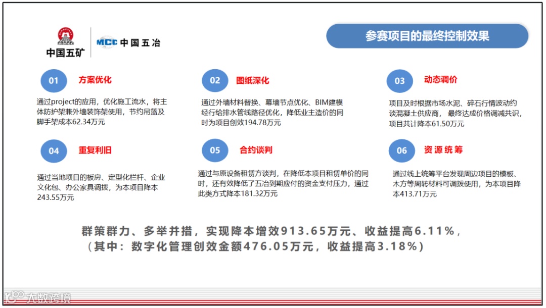 在应用数字化工具前,企业在各个成本管理阶段面临着数据积累困难、成本控制效果不佳、动态管理时效性不强等痛点。企业按照“集中集约、分级管理”的原则,从标前三段式评审到结算项目复盘,每个环节都按制度刚性、标准化执行,全面实现成本数据的可比性和可追溯性。通过数字化手段的支撑,项目取得了显著的降本增效成效。例如,在某项目中,企业通过方案优化、动态调价、合约谈判、图纸深化和资源统筹等措施,仅通过数字化管理创效金额就达到 476.05 万元,收益提高 3.18%。
