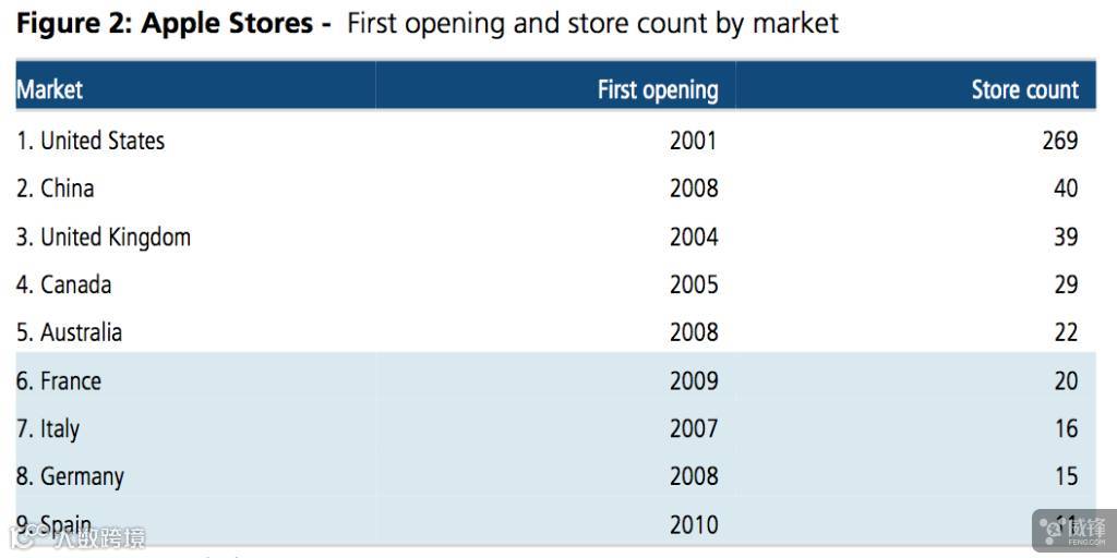 威锋网 4 月 1 日消息,瑞士联合银行发布的最新报告表示,苹果公司已经放慢了在欧洲开设苹果零售新店的脚步,更倾向于加快在中国大陆开店。苹果在法国、德国、意大利和西班牙的零售店数量为每国大约 20 家。报告指出苹果公司有意在 iPhone 渗透率较低的市场中寻求增长。