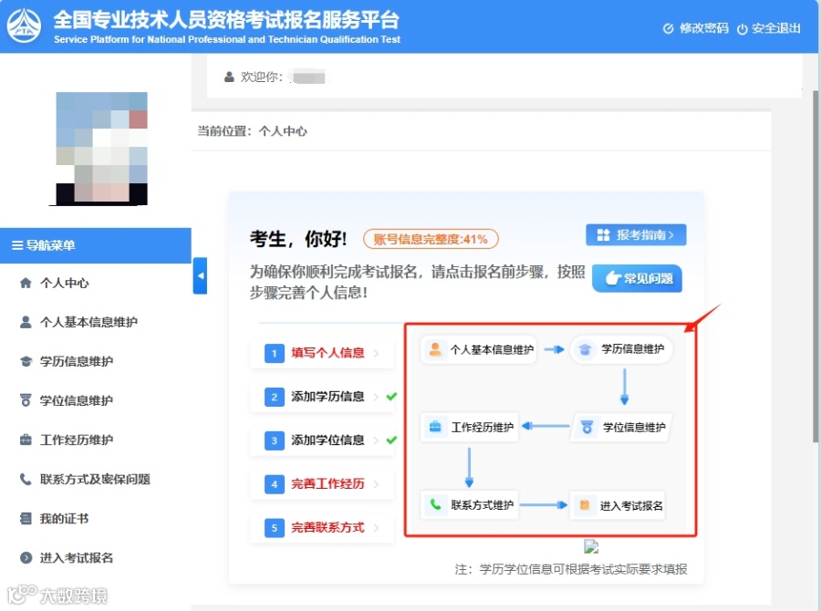 报名考试之前需要把上述信息进行详细填报,待到“账号信息完整度”为100%时才可进入考试报名。
