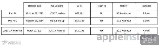 如图 iPad Air 之后,802.11ac 无线标准得到行业更多支持。对于 Air 用户来说,升级到 2017 年 iPad,无线标准就是一个很大的变化了,除非用户的网络设施还不支持这种标准。