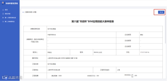 提交申报表成功后自动跳转到申报表详情页面,点击导出按钮,系统自动导出PDF格式文档。参赛项目需打印盖章后扫描成PDF格式以备后续上传使用。
