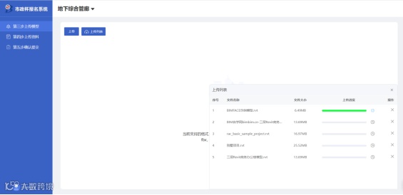 在“第三步上传模型”中上传参赛项目模型文件(智慧工地应用组、数字化平台应用组可根据项目实际情况上传模型,如果没有BIM模型,可不上传),系统支持rvt、3dxml、gim、ifc、igms、fbx、3dm、stp、gltf、skp、glb、dgn和nwd格式。