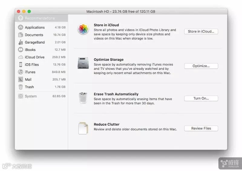 摆脱掉一些大型的文件,特别是当您的启动盘已满时,这肯定会有所帮助。如果您的设备正在运行 macOS Sierra,请单击 Apple 图标,选择关于我的 Mac,然后从储存空间选项卡中选择“管理”。这将打开 Sierra 新的存储管理工具。用户使用侧边栏可以查看不同的方式,这样您就可以获得一些空间。尝试删除占用大量空间的应用和文件吧。