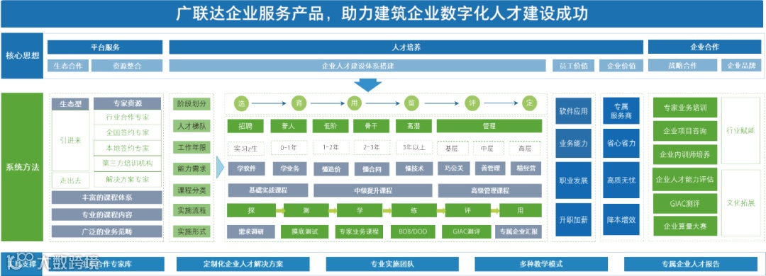 广联达数字化人才建设解决方案将企业人才需求与业务战略高度匹配,实现人才管理智慧决策,为建筑行业人才高质量发展奠定坚实基础。通过联合行业内业务专家搭建人才培养体系形成学、练、考、评、踪一体化的人才建设解决方案,同时搭配上丰富的题库及智能测评平台,解决企业对员工培养缺乏长远规划、培养周期长、形式单一、内容脱离培训对象、实战经验无法传承等问题。在企业内激发学习动力,创造良好培养环境,实现人才精细化管理,助力企业数字化人才建设成功。