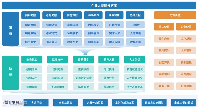 企业大赛建设方案是专注于为企业提供从赛事策划到落地的全过程大赛解决方案,帮助企业高效、公正地完成赛事执行,节约大赛人力投入。企业通过大赛及号召员工备赛,全面了解员工的能力情况,完善人才档案与梯队建设;通过创奖评优,发掘优秀人才树立标杆,以赛促学,提升团队整体能力水平,促进企业精细化人才管理,助力企业降本增效。