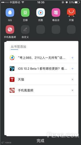 导航作为方便用户直达常用网站的一项功能当然是必不可少的,不过“夸克浏览器”并没有像其他浏览器那样无节操地将过多导航图标塞进主页面,这里最多只会呈现 10 个导航。在导航编辑页面中,同样采用卡片式设计,你可以从历史记录或是书签中添加导航,针对不同的网站会有不同的 Logo,让用户一眼就知道该导航指向何方,最重要的是,这里的导航编辑够纯净,少了那份俗气的商业味道。