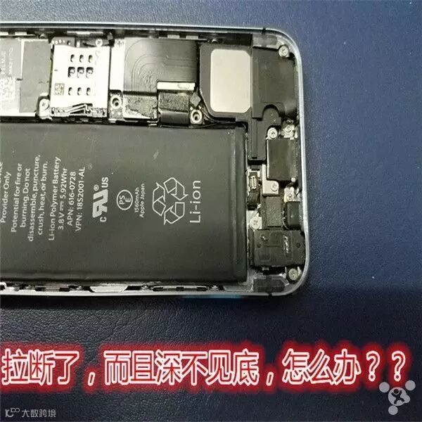该锋友表示,很多朋友在给 iPhone 5s、6/6 Plus 以及 6s/6s Plus 更换电池的时候会遇到电池胶被拉断的情况,此时将电池拆卸下来难度就比较大,很多新手可能会直接用镊子,螺丝刀,撬棒等工具将电池按照 iPhone 5 之前的方式直接撬下来,这可能会导致电池变形、起火燃烧甚至是整个 iPhone 报废。