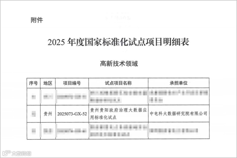 近日,国家标准化管理委员会公布2025年度国家标准化试点项目名单,由中电科大数据研究院有限公司(以下简称中电科大数据院)申报的“贵州贵阳政府治理大数据应用标准化试点”项目成功入选,标志着贵州省在推动政府治理数字化、标准化融合方面迈出关键一步。