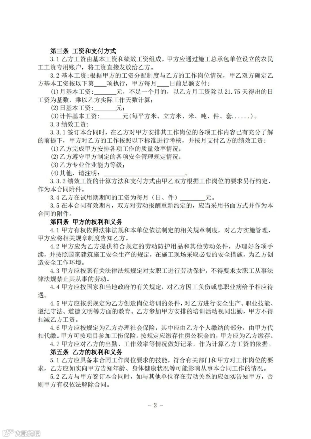 为规范建筑用工管理,保障建筑工人合法权益,更好地为建筑企业和建筑工人签订劳动合同提供指导服务,住房和城乡建设部、人力资源社会保障部根据《中华人民共和国劳动法》《中华人民共和国劳动合同法》《中华人民共和国建筑法》《中华人民共和国劳动合同法实施条例》《保障农民工工资支付条例》等法律法规及有关政策规定,制定了《建筑工人简易劳动合同(示范文本)》。现印发给你们,供建筑企业和建筑工人签订劳动合同时参考。