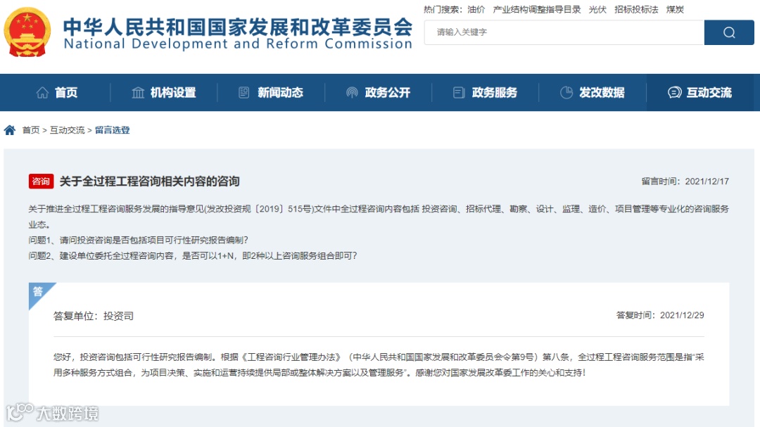 2021年12月17日,有网友在发改委提出《关于全过程工程咨询相关内容的咨询》。