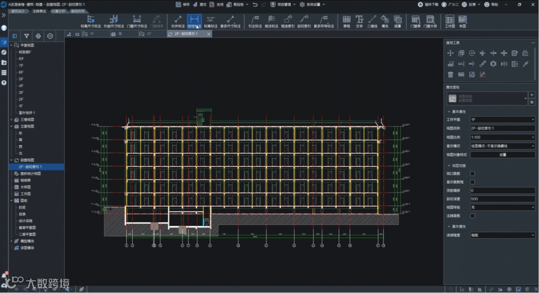 在项目设计过程中,采用了数维设计软件智能标注功能,快速对平面进行标注,提高了过程效率。对于难以生成的斜轴网标注,采用人工检查的方式确保满足出图标准。