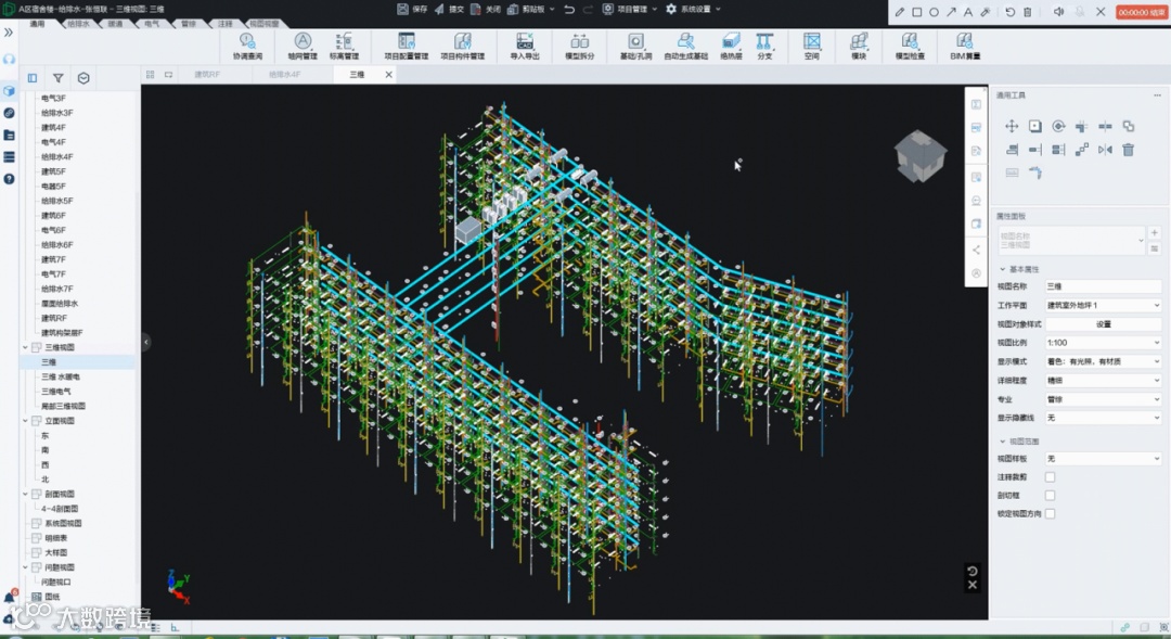 项目组基于国产BIM“数维”设计软件,通过“云+端”协同设计模式完成全过程正向设计,通过各专业链接模型,调整适合的显示方式,达到多专业协同设计的要求。在校审阶段,与国家鼓励的“审图”政策接轨,二三维联审,图模差异一目了然,提升设计质量。