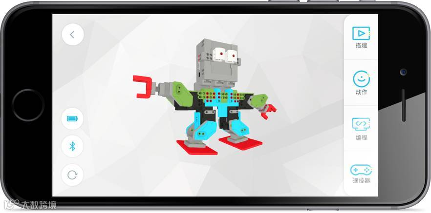 在进入主界面之后,在右边我们能看到,搭建、动作、编程、遥控器。左侧是返回,电量支持蓝牙和刷新。