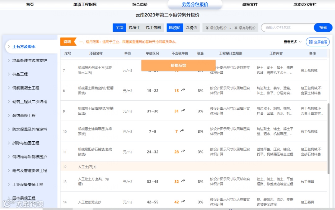 你看看人家这个劳务分包价格,所有的专业基本都涵盖了,还有工作内容和计算规则,这个可比我们找的分包报价细致多了,你看这价格也是和当地的差不多啊,难得有这么好的网站,要好好使用