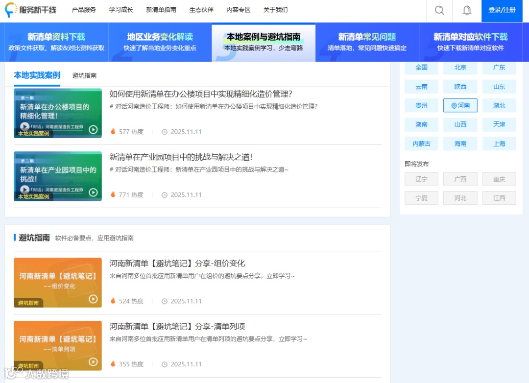 别愁,广联达【一站搞定新清单】专题页,正是你的高效“攻略”。在这里,你能开启“地区旅行”打卡国标新清单和14个地区新清单实施意见的要点,也能沉浸式“内容旅行”,解锁全国多个地区业务变化解读、案例避坑指南、高频问题解答等等板块。
