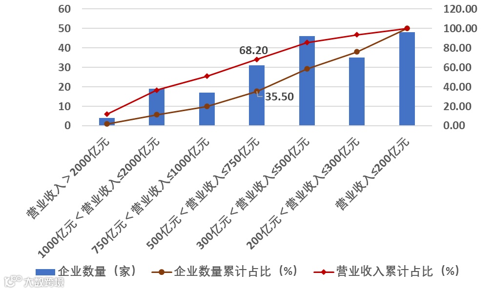 从200家上榜企业的营业收入分布看,不同营业收入水平企业的数量分布及其营业收入占上榜企业总营业收入的比重情况,如图3所示。