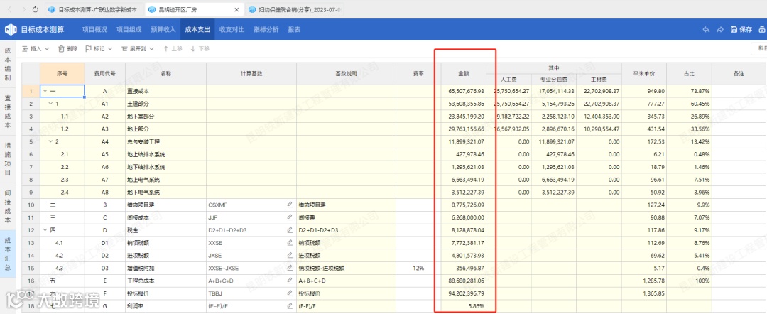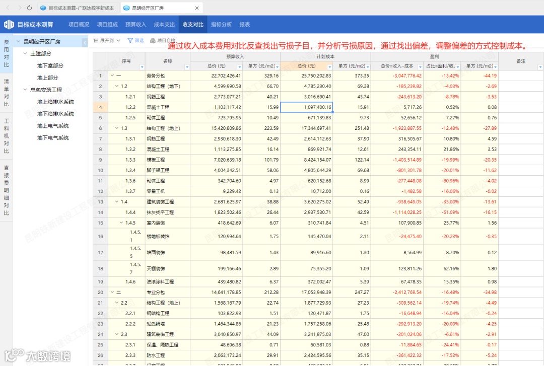 (2)根据企业自身规范制定企业实际测算成本科目,统一成本科目编制标准,形成成本科目库,新项目测算时可选择的对应的科目模板进行测算,通过投标报价与实际项目成本科目匹配,进行横向收支自动对比分析,盈亏一目了然,让测算更轻松。