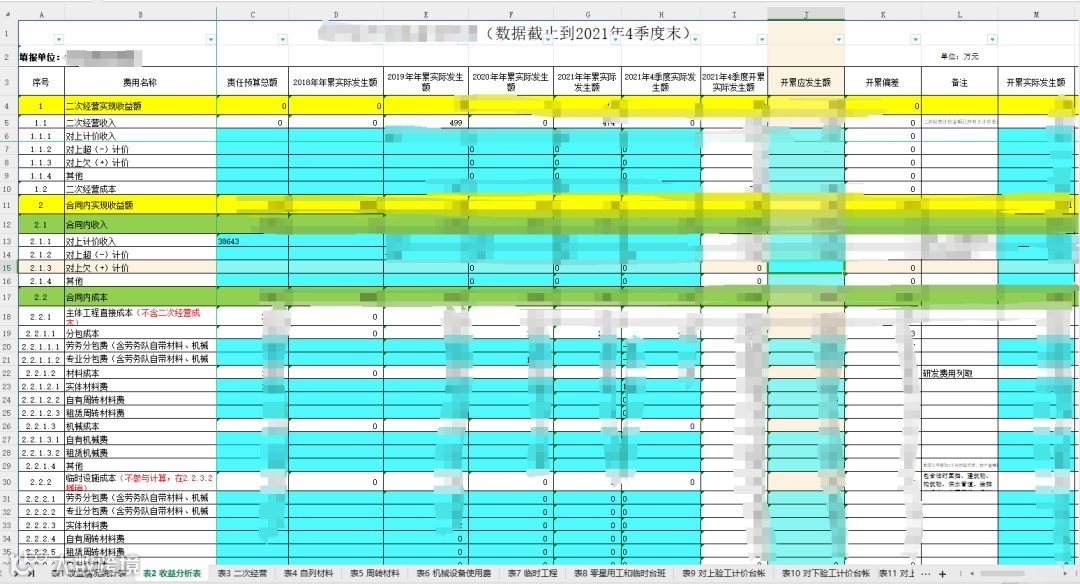 将对上工程量清单导出表格后添加分包成本一列,然后通过企业内部数据将各分部分项工序逐一填入成本单价进行对比。由于企业内部数据覆盖率不足,会存在大部分分包工序无参考数据进行比对,与分包队伍的博弈中无法达到预期值。(通常一个清单下会有多条定额子目,且还可能出现一条清单对应多个分包队施工的情形,如出现该情形,表格测算将无法做到一收入对应一成本的情况)进而导致结算整理费用时,因为各种各样的事情导致成本超支。