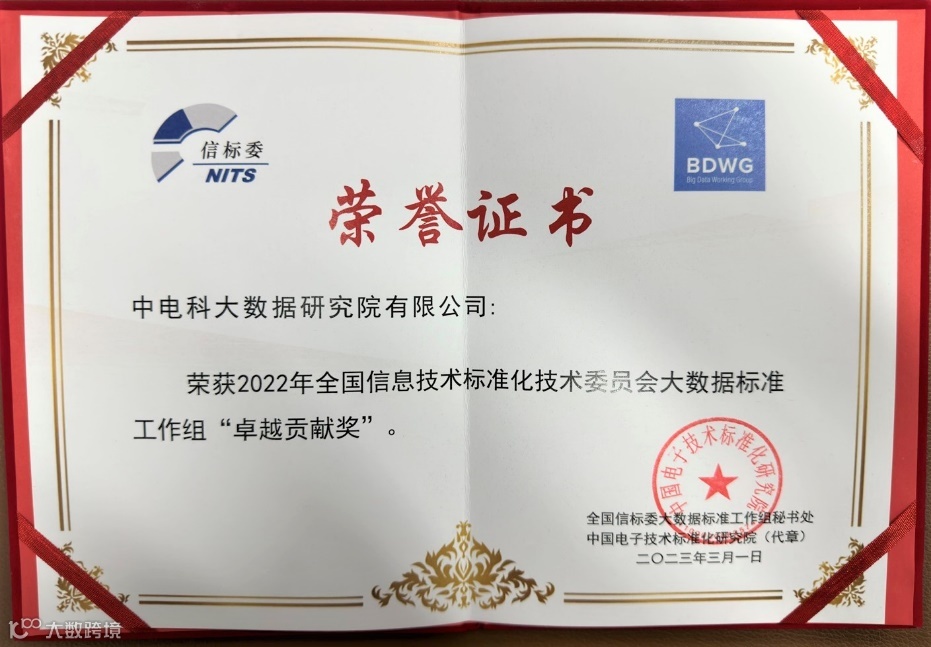 3月9日,“2023全国大数据标准化工作会议暨全国信标委大数据标准工作组第九次全会”在广州召开,中电科大数据研究院有限公司(简称,中电科大数据院)受邀参会。会议重点围绕大数据标准化、数据要素市场化、大数据治理、行业大数据等研究和应用实践等领域,对过去的工作进行全面总结,并对接下来的大数据标准化工作展开了深度研讨、部署和展望。会议颁发了2022年全国信标委大数据标准工作组卓越贡献奖、优秀奖,成员单位卓越贡献奖等重要奖项。中电科大数据院荣获2022年全国信息技术标准化技术委员会大数据标准工作组“卓越贡献奖”。