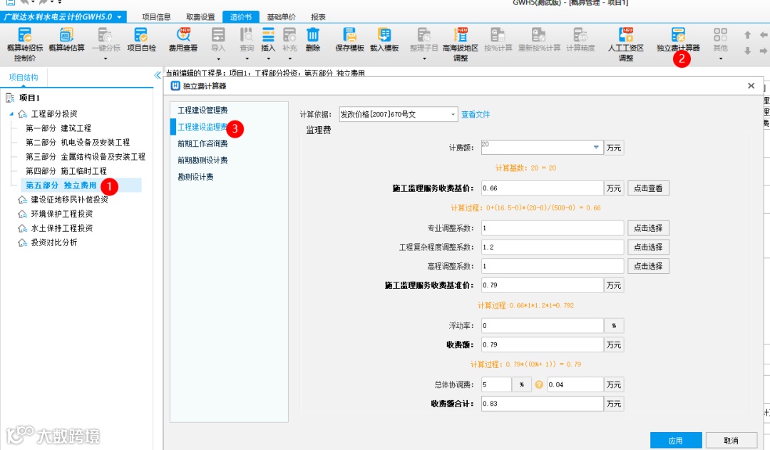 软件已按照文件要求内置好参数,根据文件中各参数的计算要求,在简单操作后,软件便可自动计算出对应的独立费用,并且会实时刷新计算结果。