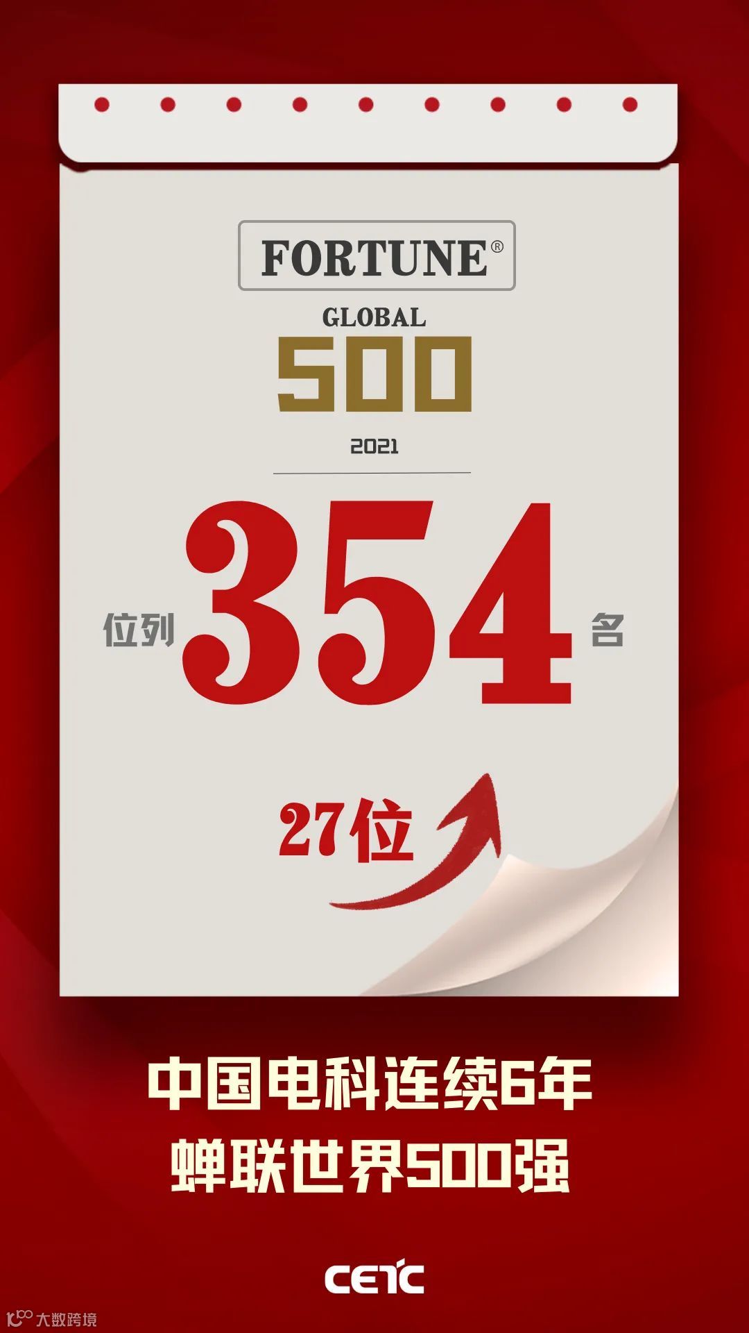 8月2日,《财富》杂志公布了“2021年世界500强排行榜”,中国电子科技集团有限公司以34311.4(百万美元)的营业收入,连续6年入选世界500强,位列第354位,较2020年,名次上升27位。