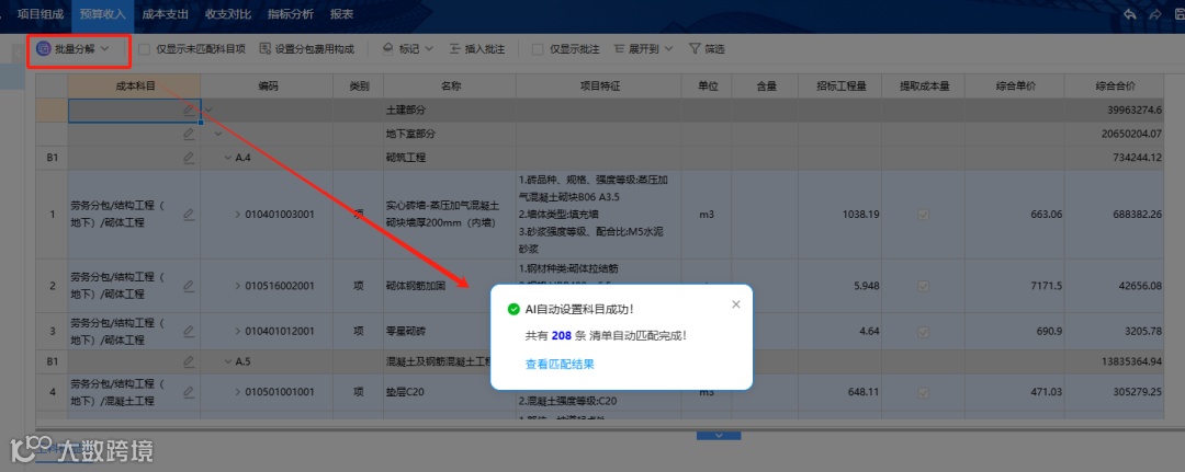 数字化方案:利用平台内置的企业标准科目库与智能测算模板,实现项目数据一键导入、AI智能分解工程量、材料与分包成本自动归类。测算结果可轻松提审、归档,形成可复用的企业数据资产。