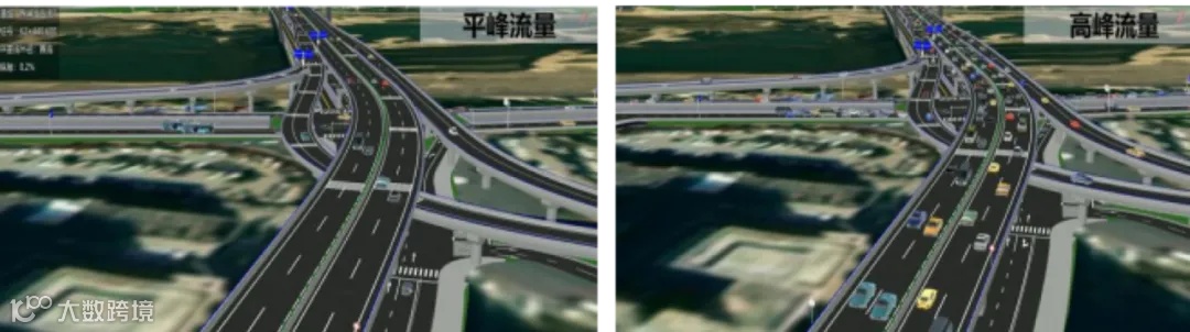 利用BIM+无人机航拍监控统计各时段交通数据,并绘制交通量分析图以及交通量分析表,将VISSIM交通仿真数据导入鸿城平台中,模拟项目建成后的平峰及高峰交通运行情况,通过直观分析交通拥堵点,实时修改交通组织方案,确保建成后达到缓解交通拥堵的设计初衷。