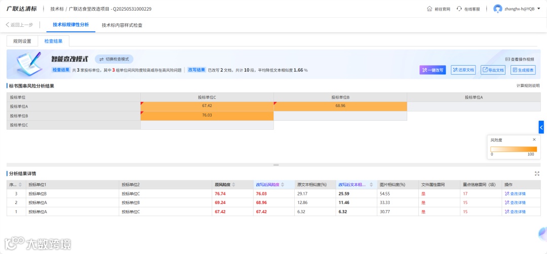 支持上传10+份标书,自动识别重复段落,一键智能改写无遗漏。