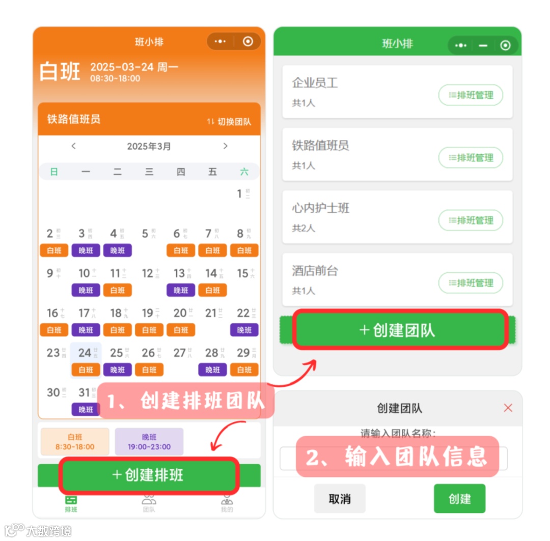 导读:点击创建排班,输入团队名称并创建。选择班次并添加到对应日期,点击发布即可完成排班。