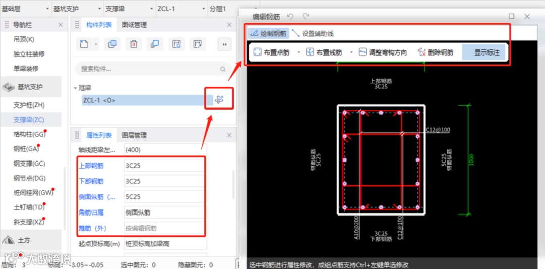 支持按地连墙智能布置导墙,精准计算导墙土建及钢筋工程量,支持钢筋三维。