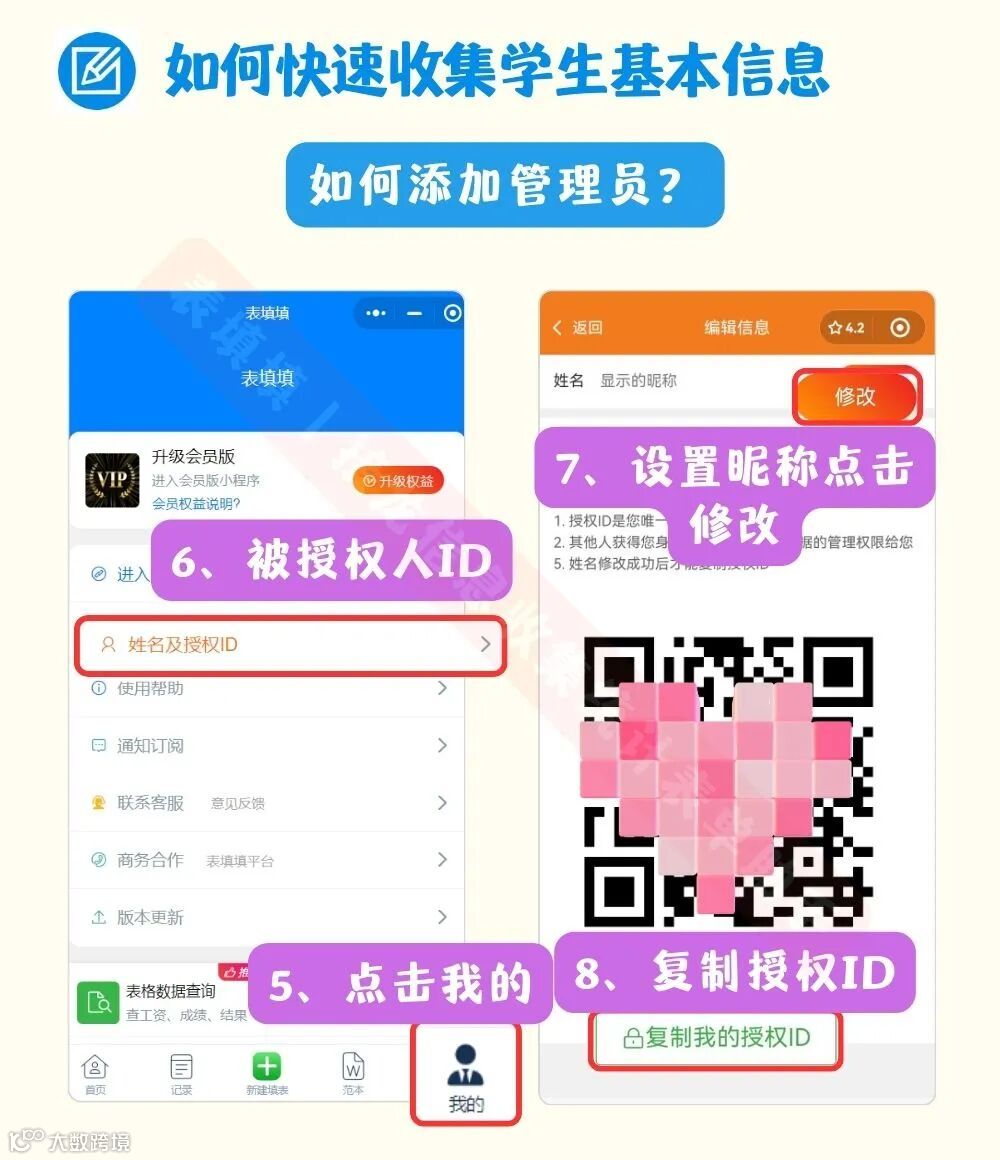 2、被授权的各班老师,进入表填填,点击【我的】、【姓名及授权ID】、修改昵称,复制我的授权id。