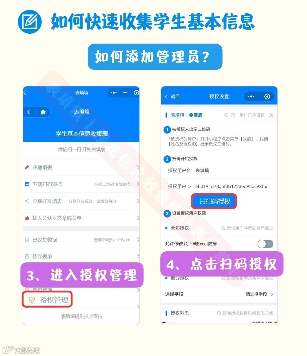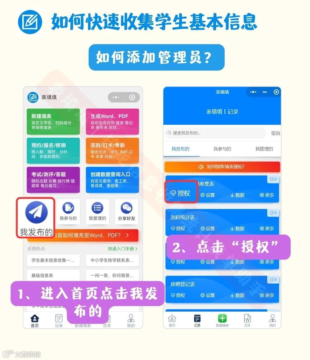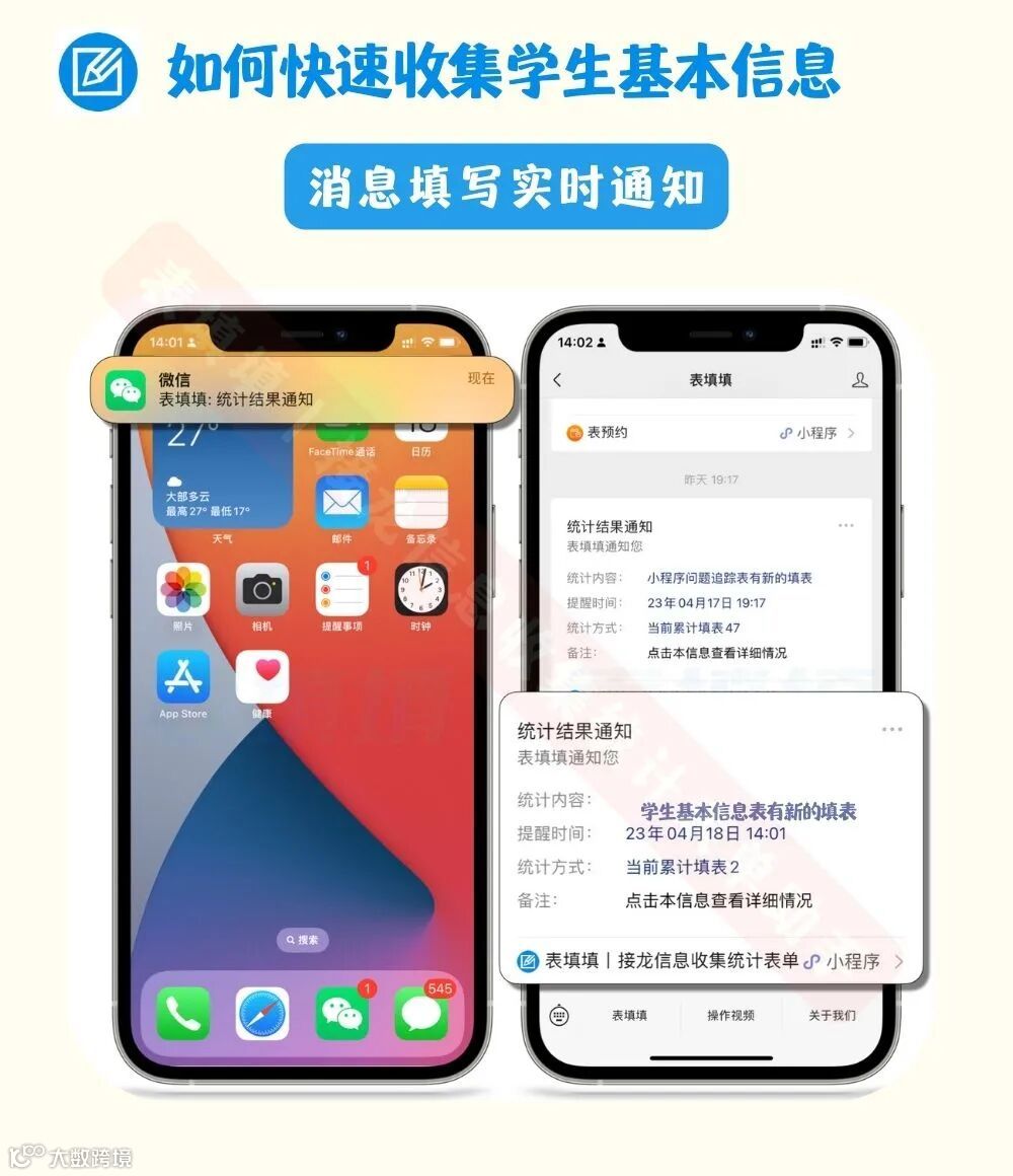 表填填小程序,可以让学生在线填写,老师实时接收填表通知,并可设置多个管理员协同办公,提高信息收集的效率。
