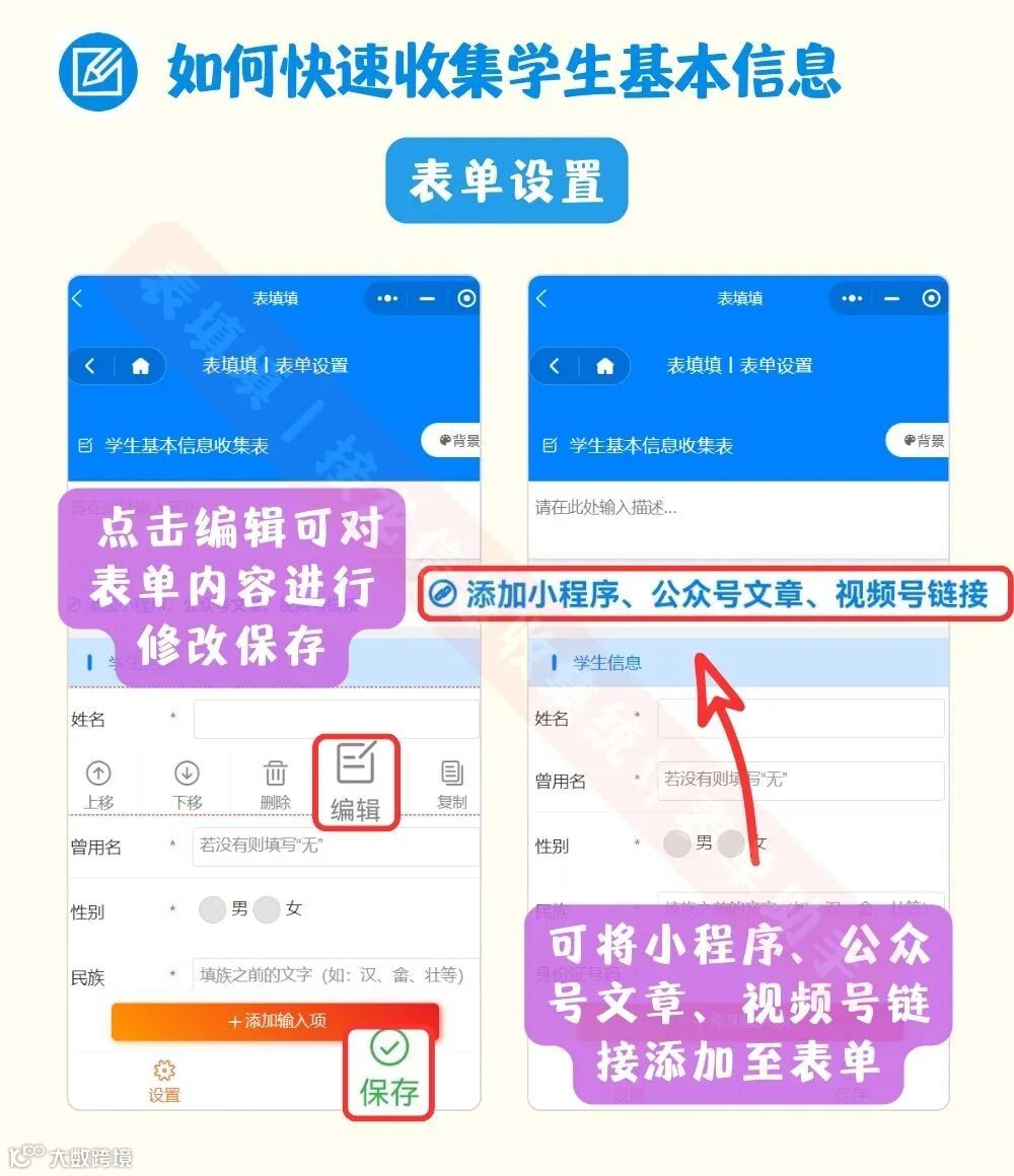 可在表单基础上新增或修改填写内容,设置完成点击「保存」,还可添加小程序、公众号、视频号到表单。