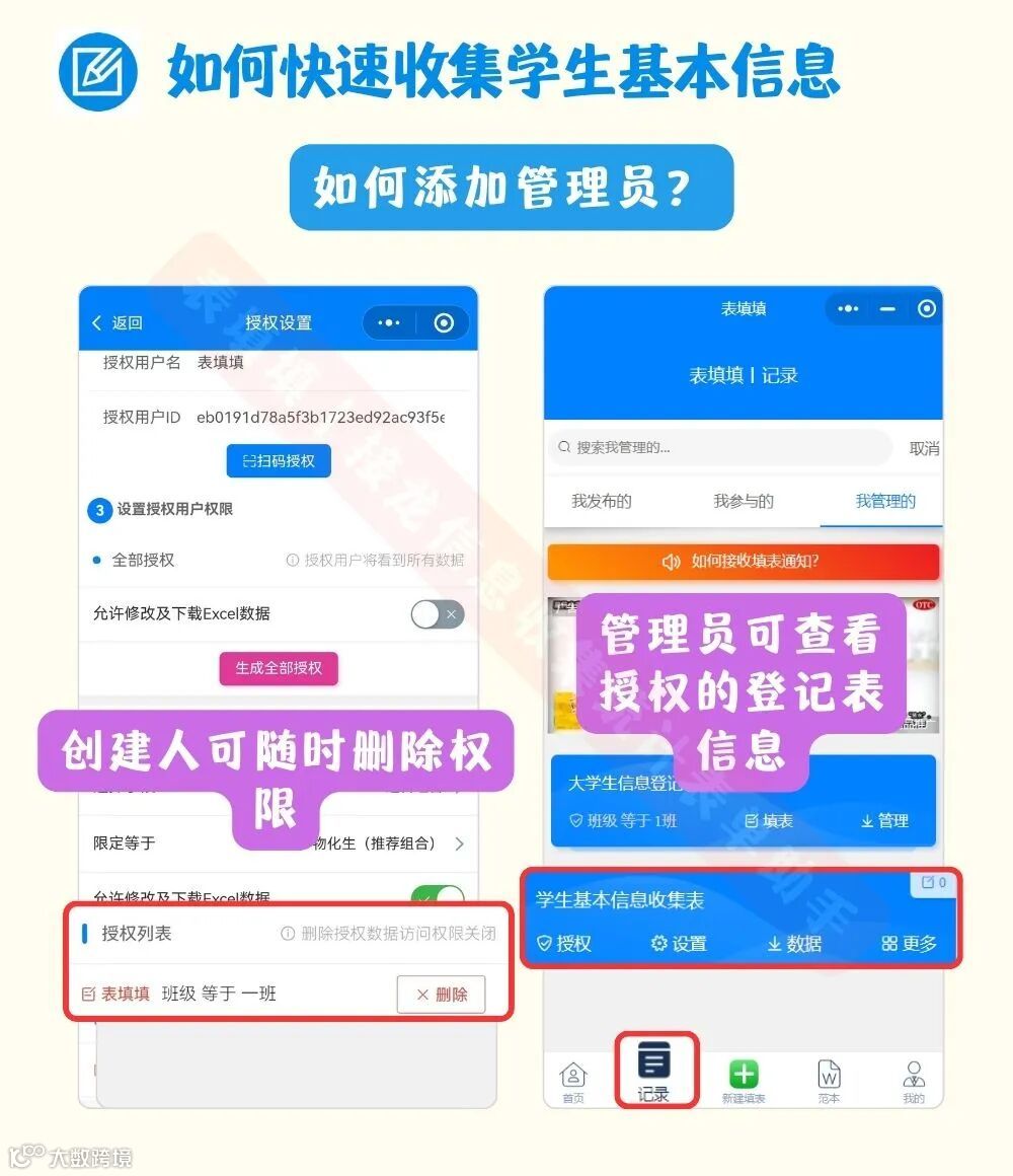 4、创建人可随时删除权限,被授权的老师可点击「记录」、「我管理的」点击相应的表单即可进入管理页进行查询、修改和下载Excel的操作。