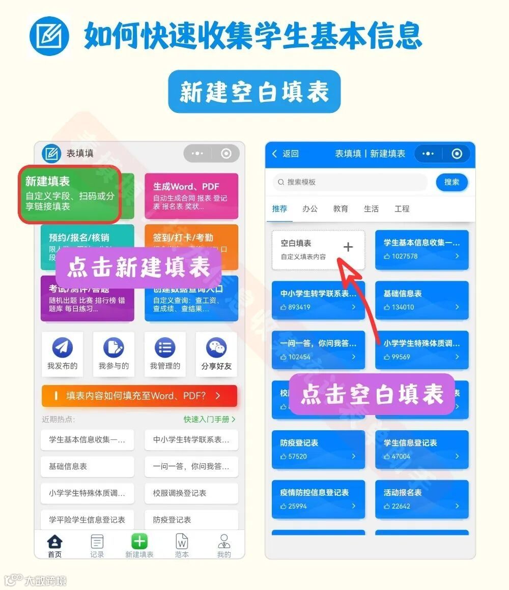 表填填丨接龙信息收集统计表单提供多种模版,学生基本信息统计表/高中分班选课统计表Excel模板/高一选科意向表/报名表、在线表格等,只需进入「表填填丨定制表格数据搜索助手」。扫描下方二维码或访问小程序链接来试试吧!